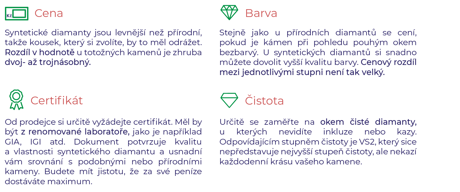 Při nákupu věnujte pozornost stejným faktorům, jako kdybyste vybírali přírodní diamant, to znamená 4C. Mrkněte se i na pár doporučení, která jsme si pro vás připravili.