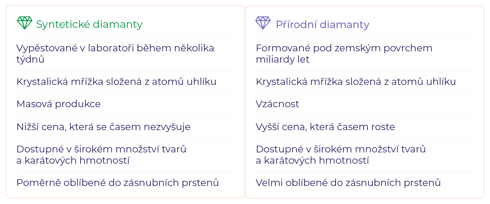 Oba typy diamantů se liší hlavně způsobem vzniku, cenou, vzácností a tím, jak moc jsou žádané. Pro lepší představu jsme pro vás připravili přehlednou tabulku.