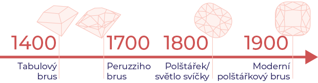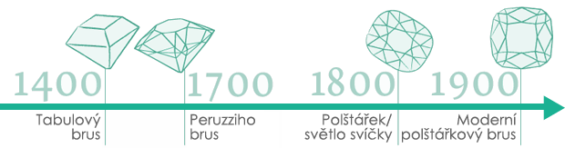 Polštář nebo také brus "světlo svíčky“ byl vyvinutý v 19. století. Od té doby prošel několika proměnami a určitým vývojem, který přinesl finální podobu tohoto tvaru tak, jak jej známe dnes. K vynalezení tvaru polštářku přispělo zejména vyvinutí metody štípání kamenů, jelikož tento proces pomohl maximalizovat rozptyl světla v tomto tvaru diamantu. Díky tomu ho považujeme za velmi dynamický a brilantní tvar.