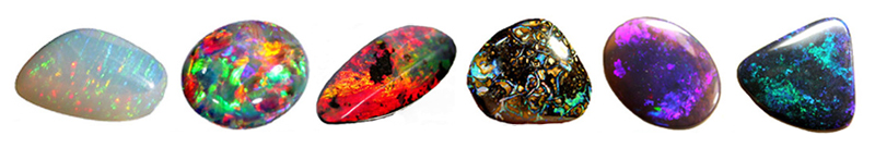 - Skelný nebo vodní opál: průsvitný až poloprůsvitný kámen s bezbarvým podkladem, vyniká výjimečnou hrou barev.