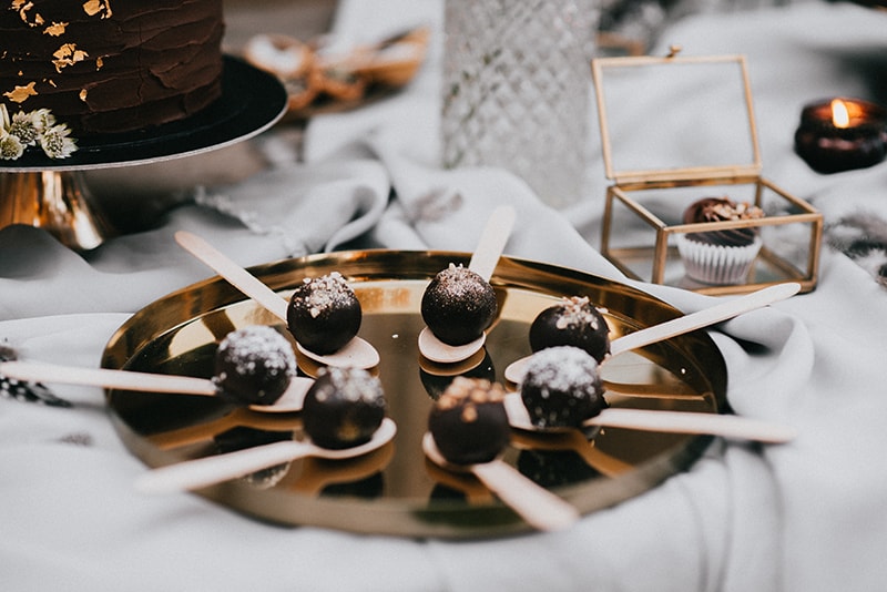 Nedílnou součástí svatebního veselí je i jídlo a pití. Neváhejte pojmout také tuto část plánování osobitě. Zima vám dovolí servírovat i potraviny, které se rychle kazí, a cukrovinky, jež by v teple roztály. Na baru kromě horké čokolády, čaje a kakaa příjemně překvapíte hosty horkým punčem, grogem nebo třeba svařákem. Vůně skořice a svařeného vína k zimní svatbě neodmyslitelně patří.
