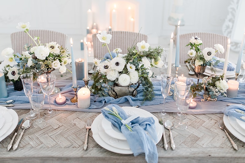 K zimní klasice patří bílá a modrá, svatbám však sluší i vánoční odstíny stříbrné, zlaté, rudé, bordó, perlové, bledě modré, starorůžové, purpurové, sytě růžové a oranžové. Výrazné svatební barvy ozvláštní tradiční bílou zimy a dodají výzdobě jiskru.