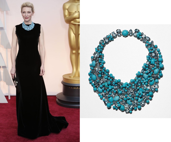 Odvážnou kombinaci zvolila v roce 2015 kráska Cate Blanchett. K jednoduchým černým šatům vybrala pestrý statement náhrdelník s akvamaríny, tyrkysy a diamanty pocházející z dílny Tiffany.