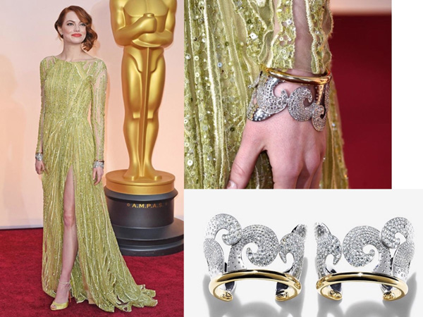 I mladičká herečka Emma Stone zvolila v roce 2015 odvážné šaty, a to ve zlatavé barvě se třpytivými glitry, což s jejími rudými vlasy působí více než étericky. K této nepřehlédnutelné kombinaci si vzala šperk tvaru manžetky ve stylu 40. let z dílny Tiffany.