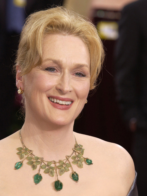 Herečka Meryl Streep zvolila v roce 2003 na předávání Oscarů secesní náhrdelník s diamanty a smaragdy, kterým dokonale podtrhla nabírané šaty černé barvy.