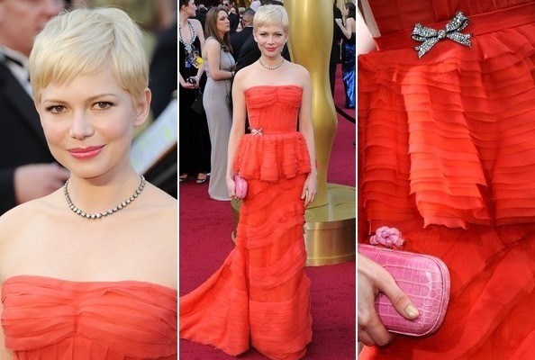 Michelle zvolila na slavnostní večer roku 2012 oranžovočervené šaty od Louise Vuittona plné volánků, které zdůraznila pomocí vintage brože ve tvaru mašle a upnutého diamantového náhrdelníku.