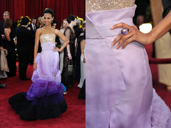 Hvězda snímku Avatar zvolila na filmový večer roku 2010 výrazné šaty fialové barvy zdobené nabíranými volánky. Dramatické šaty doplnila o platinové náušnice s diamanty a nepřehlédnutelný ametystový prsten.