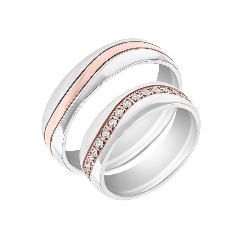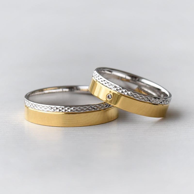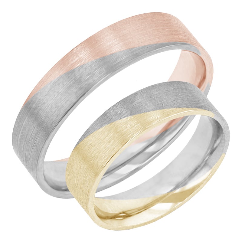 Kovové kroužky z kombinovaného zlata jsou skvělou variantou, pokud chcete mít snubní prsteny jednoduché, ale přesto extravagantní. Módní mix odstínů žlutého, růžového a bílého zlata vám může připadat trochu divoká, ale opak je pravdou. Dobře zvolené odstíny a poměr barev na kovovém kroužku obou snoubenců zajistí nádherné svatební šperky. Namixujte si žluté, bílé či růžové zlato jako koktejl lásky, který vás bude provázet po celý život.